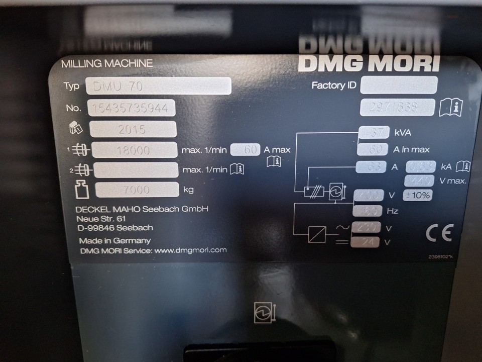 This 2015 DMG Mori DMU 70 is a versatile 5-axis machining centre, well suited to precision and complex machining tasks. It features a large 800 x 620 mm table with an 800 kg load capacity, alongside generous XYZ travels of 750 x 600 x 550 mm. The B-axis offers a range of -5° to +110° with full 360° C-axis rotation. Equipped with an 18,000 rpm HSK63A spindle, 14 kW motor, 30-tool ATC, chip conveyor, and Siemens control, this machine delivers reliable performance and flexibility.