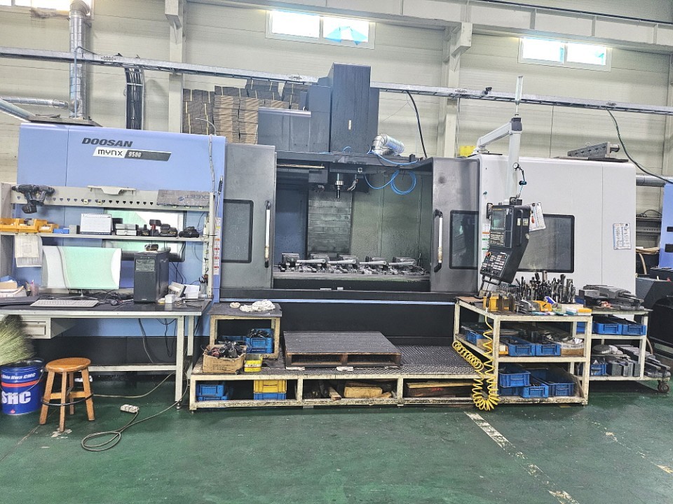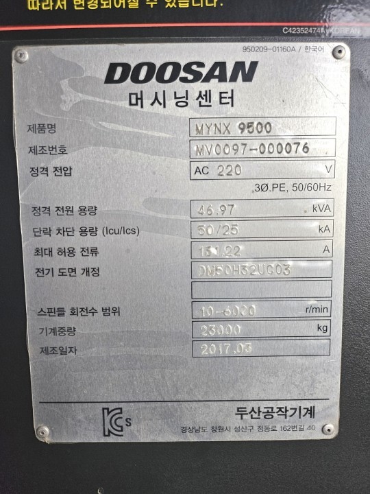 The 2017 Doosan Mynx-9500 is a large-capacity, gear-driven VMC built for heavy cutting and reliable performance. It offers generous travels of 2500 x 950 x 850 mm and a sturdy 2500 x 950 mm table with a 3,500 kg load capacity. The 6,000 rpm gear-type spindle, powered by a 25/30 kW motor, delivers strong torque for demanding machining. With a 30-tool ATC, chip conveyor, and Fanuc control, this machine provides a solid mix of power, rigidity, and efficiency for a wide range of workshop applications.